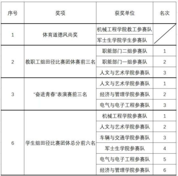 在赛事表彰环节,人文与艺术学院凭借优异表现,荣获"奋进青春"主题表演一等奖,并在学生组田径比赛团
